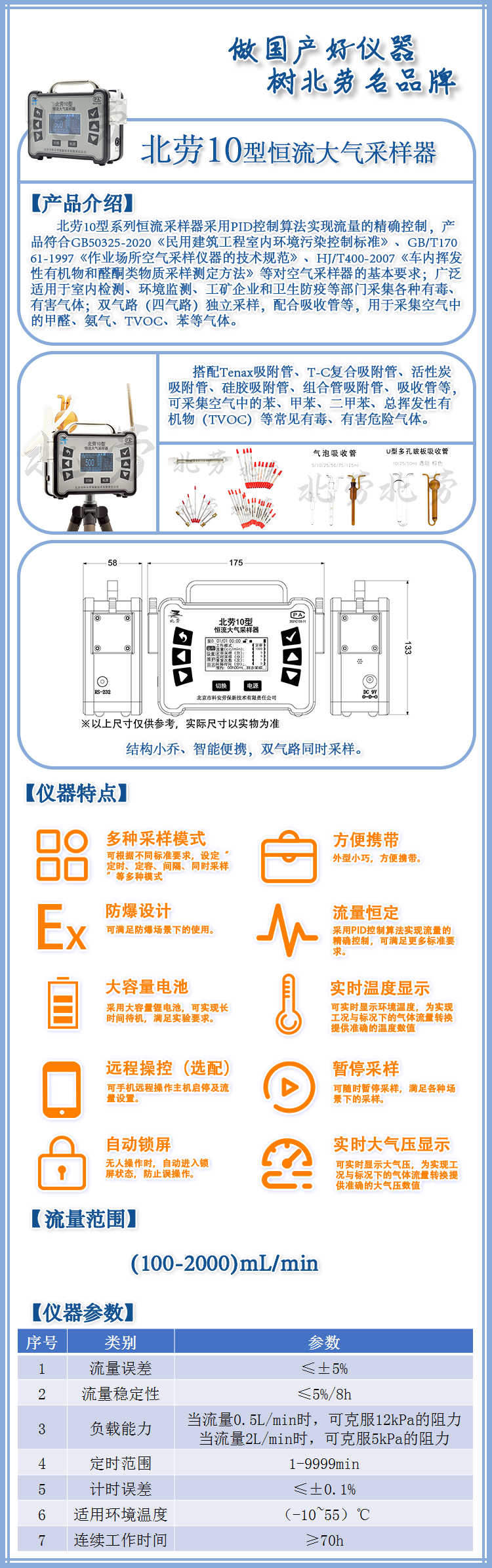 產品描述:北勞10型 系列恒流采樣器采用PID控制算法實現流量的精確控制,產61-1997《作業場所空氣采樣儀器的技術規范》、HJ/T400-2007《車內揮發61-1997《作業場所空氣采樣儀器的技術規范》、HJ/T400-2007《車內揮發性有機物和醛酮類物質采樣測定方法》等對空氣采樣器的基本要求......