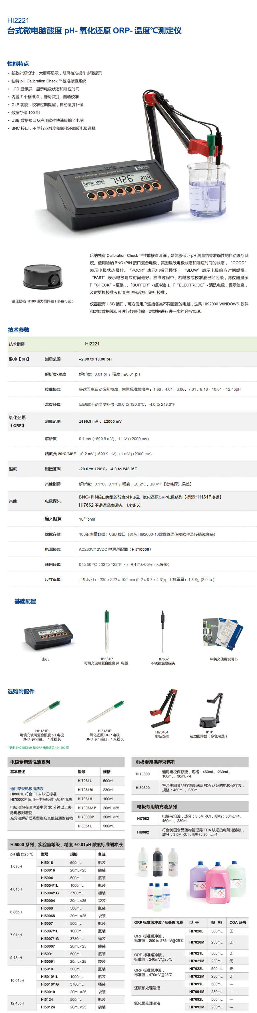 主機,HI1131P 可填充玻璃復合酸度電極,HI7071S 專用電極填充液,規格:30mL,HI7662 不銹鋼溫度探頭,酸度標準緩沖液套裝(標準值@25°C:4.01pH、7.01 pH 和常規電極清洗液,規格:20mL×4),HI76404N 定制專用電極支架,HI710006 AC230V/12VDC 電源適配器,中英文使用說明書