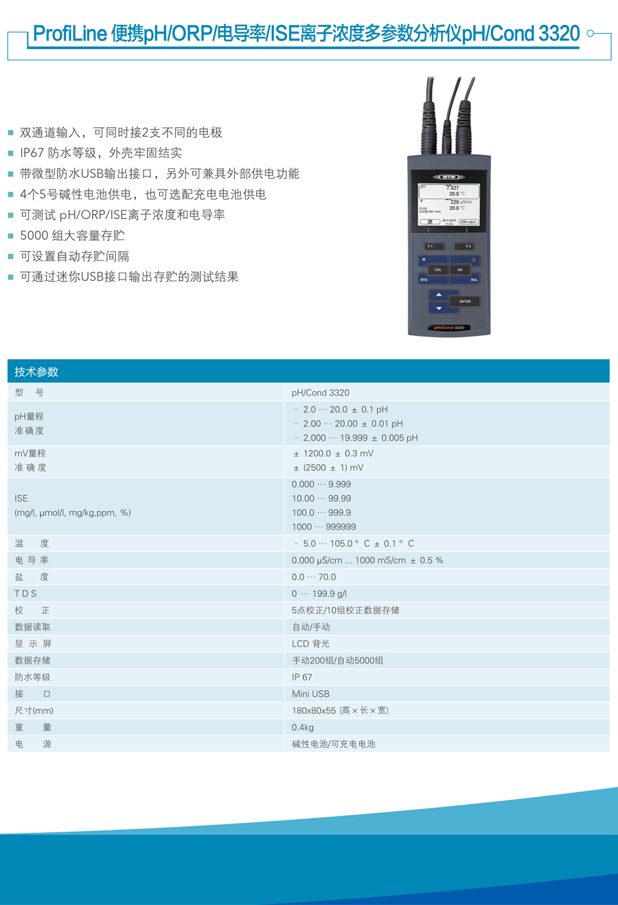 德國WTW PH/Cond 3320手持式多參數測試儀操作簡單,使用方便,德國WTW PH/Cond 3320手持式多參數測試儀可連接各種模擬的標準PH復合電極,ORP電極,離子電極和電導率電極。
