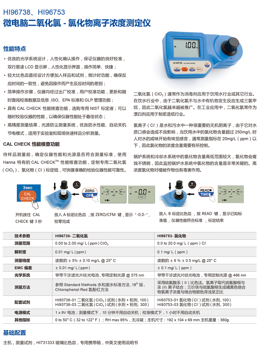 主機,HI93738-01 專用二氧化氯試劑,HI96738-11 專用二氧化氯NIST測量曲線標定組,HI731333 定制專用玻璃比色皿(2個),HI731318 專用玻璃比色皿清潔布(2塊),中英文使用說明書,HI721018 定制專用儀器攜帶箱【溫馨提示:為了方便快捷添加樣品,請選購HI740157P專用微量塑料吸管(20個/組),用于待測樣品的提取,也避免交叉污染】