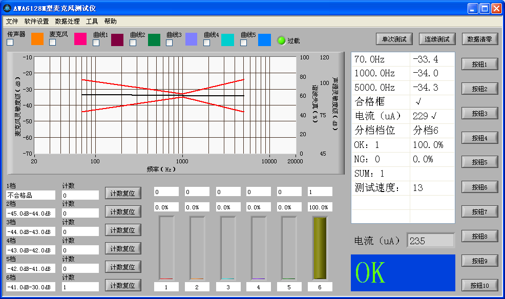 AWA6128M型駐極體傳聲器測試儀主要由測試主機、帶聲反饋測試傳聲器的測試聲源和控制盒等組成,主要配合分選臺對駐極體傳聲器(咪頭)進行自動分類。測試儀同時測量駐極體傳聲器的低頻靈敏度、1 kHz靈敏度、高頻靈敏度和工作電流等參數。高頻和低頻測試頻率可自行設定,也可選擇不測。根據駐極體傳聲器的中頻靈敏度、低頻上下限、高頻上下限、漏氣、電流等測量結果對駐極體傳聲器進行分類,通過串口輸出分檔指令給分選臺,并統計分類結果。簡潔直觀地顯示 PASS/NG測量結果,自動判斷良品和不良品,極大的提高了測試效率。聲反饋測試傳聲器同時測量聲源的聲壓,反饋控制信號源的輸出,使聲源聲壓保持恒定,從而排除由于測試聲源聲信號的不穩定而造成的測試結果前后變化。