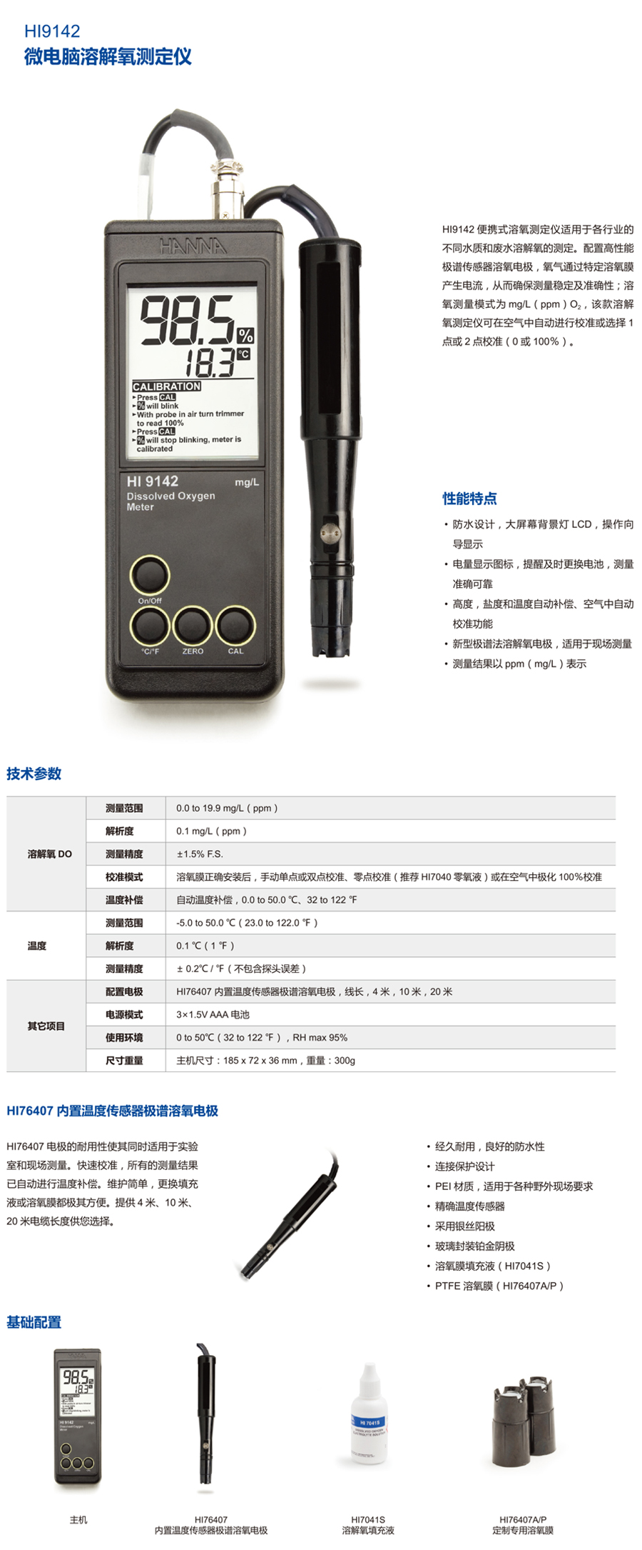 主機,HI76407/4內(nèi)置溫度傳感器極譜溶氧電極,4米線長,HI76407A/P 定制專用溶氧膜,數(shù)量:2個,HI7041S 專用溶氧填充液,規(guī)格:30mL,中英文使用手冊,HI721046定制專用攜帶箱