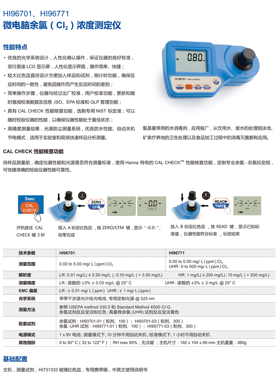 主機(jī),HI93701-01 專用余氯DPD試劑,HI731333 定制專用玻璃比色皿(2個(gè)),HI731318 專用玻璃比色皿清潔布(2塊),中英文使用說(shuō)明書(shū),HI721006 定制專用儀器攜帶箱【溫馨提示:為了核查儀器性能,請(qǐng)訂購(gòu)HI96701-11余氯NIST測(cè)量曲線標(biāo)定組】