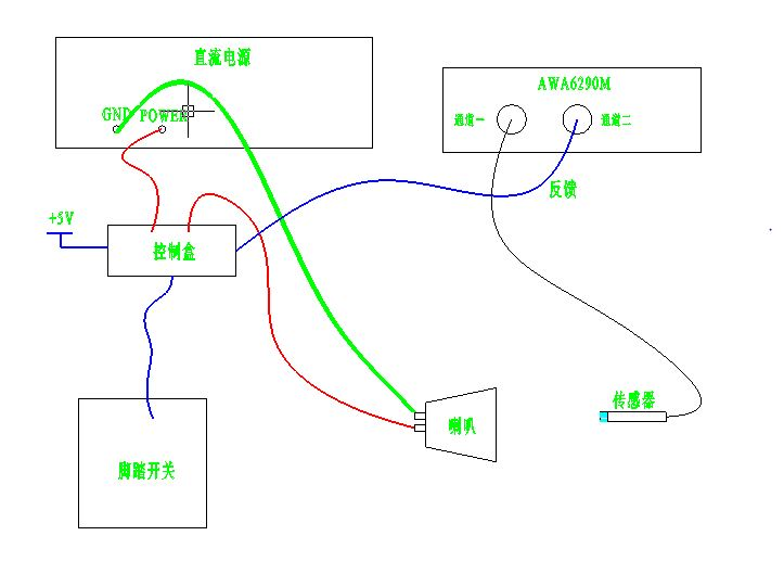 踩下腳踏開關后,電源控制盒接通直流穩壓電源與喇叭之間的通路,并保持;再次踩下腳踏開關,斷開電路。