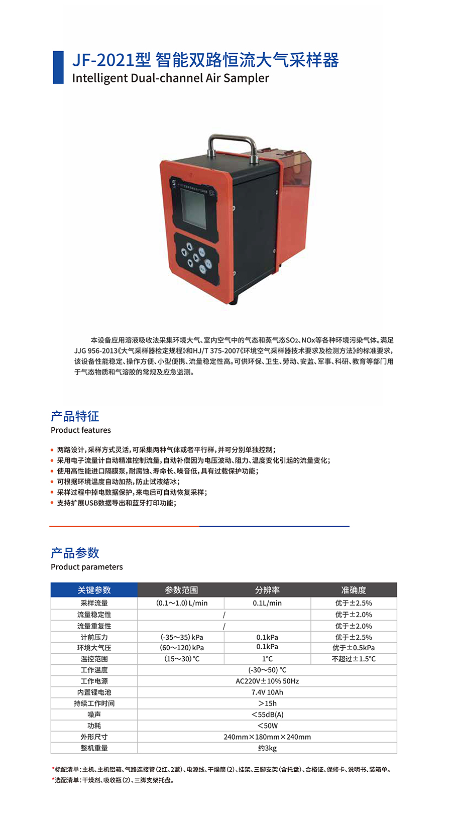 產品名稱:JF-2021型智能雙路恒流大氣采樣器