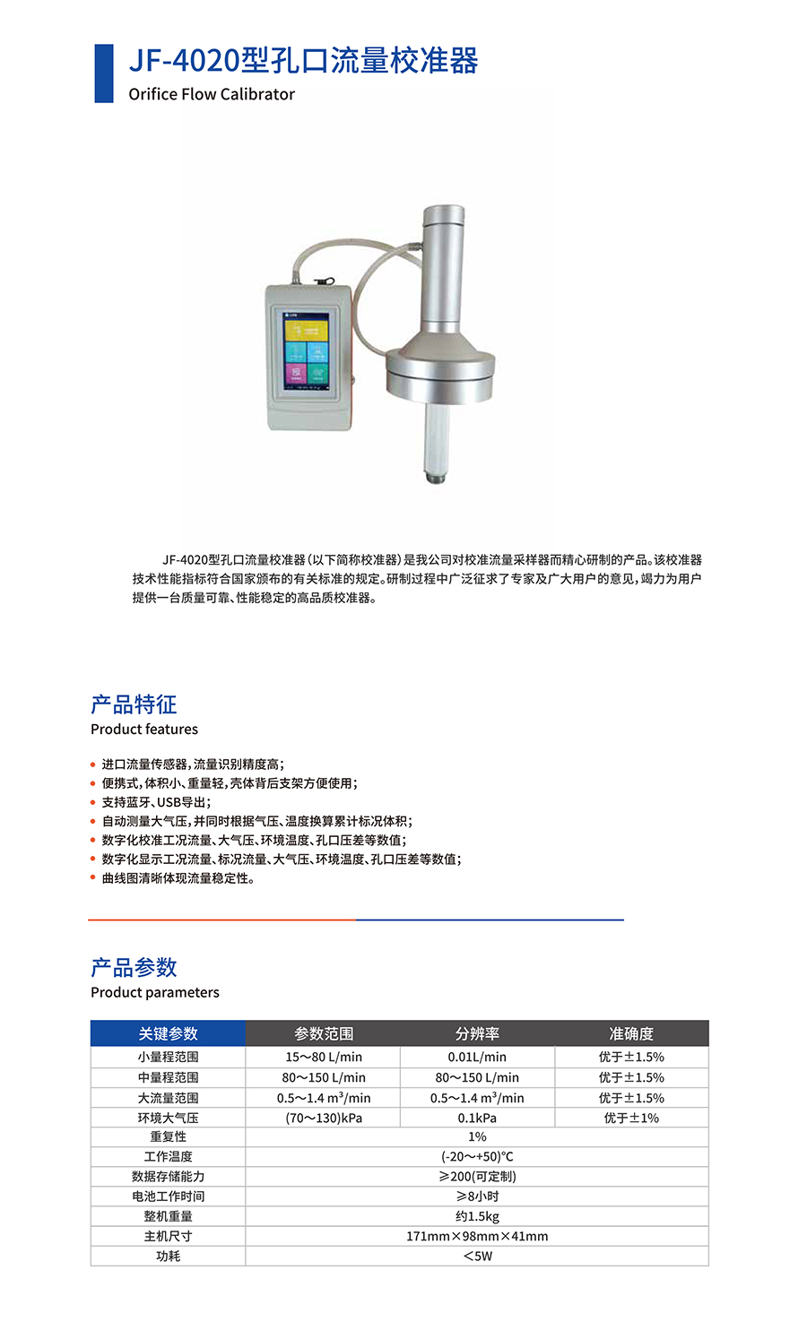 產品名稱:JF-4020型孔口流量校準器