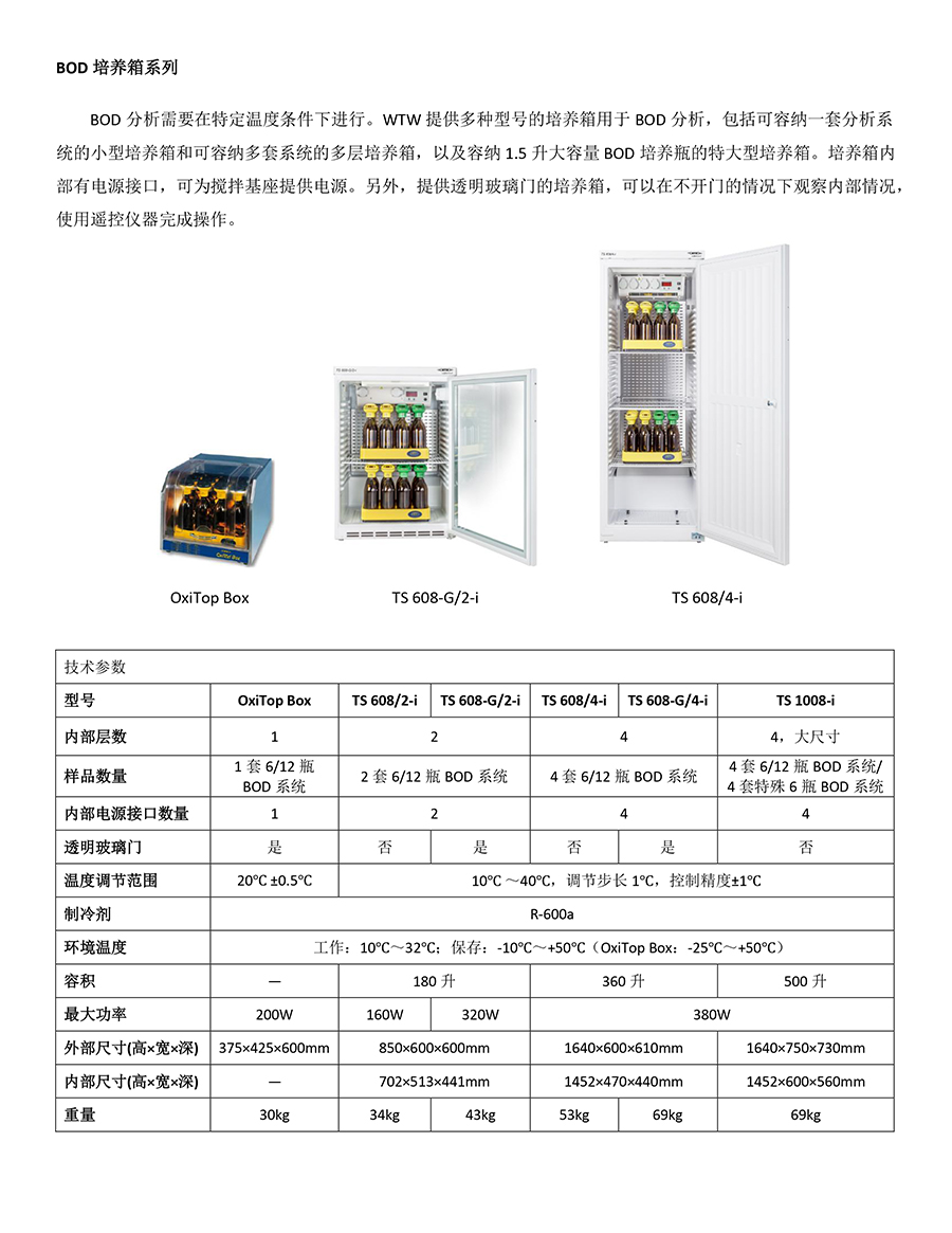 BOD 分析需要在特定溫度條件下進行。WTW 提供多種型號的培養箱用于 BOD 分析,包括可容納一套分析系統的小型培養箱和可容納多套系統的多層培養箱,以及容納 1.5 升大容量 BOD 培養瓶的特大型培養箱。培養箱內部有電源接口,可為攪拌基座提供電源。另外,提供透明玻璃門的培養箱,可以在不開門的情況下觀察內部情況,使用遙控儀器完成操作。